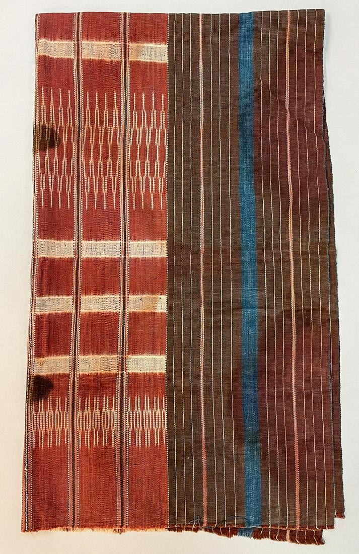 Chin, Myanmar (Burma), vintage woven coarse cotton textile, rust, brown, blue, mauve stripes and check with traditional pattern, consists of two panels sewn together, 56"l x 32"w