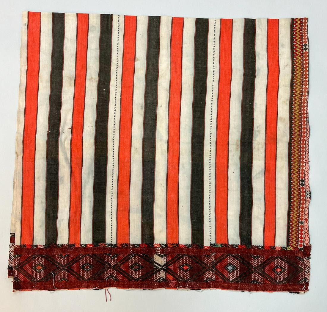 Chin, Myanmar (Burma), vintage woven cotton textile, orange, black, undyed cotton color stripes with embroidery on edges, consists of three panels sewn together, 55"l x 30"w
