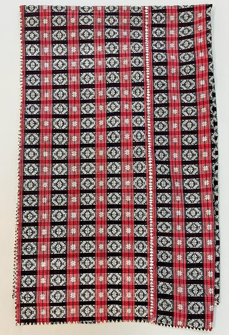 Northern Luzon, Philippines, vintage woven cotton bed spread, red and white diamond embroidery stripes, consists of three panels sewn together, 74"L x 47"w
