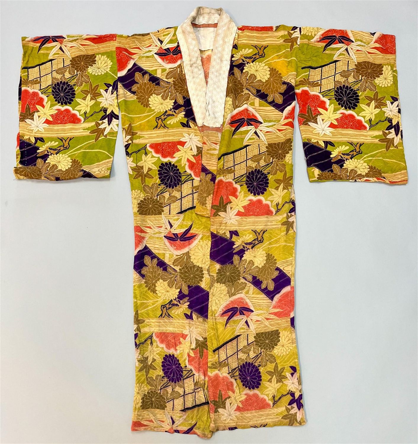 Japan, vintage silk chirimin stencil dyed floral pattern kimono, 46"l x 18"w