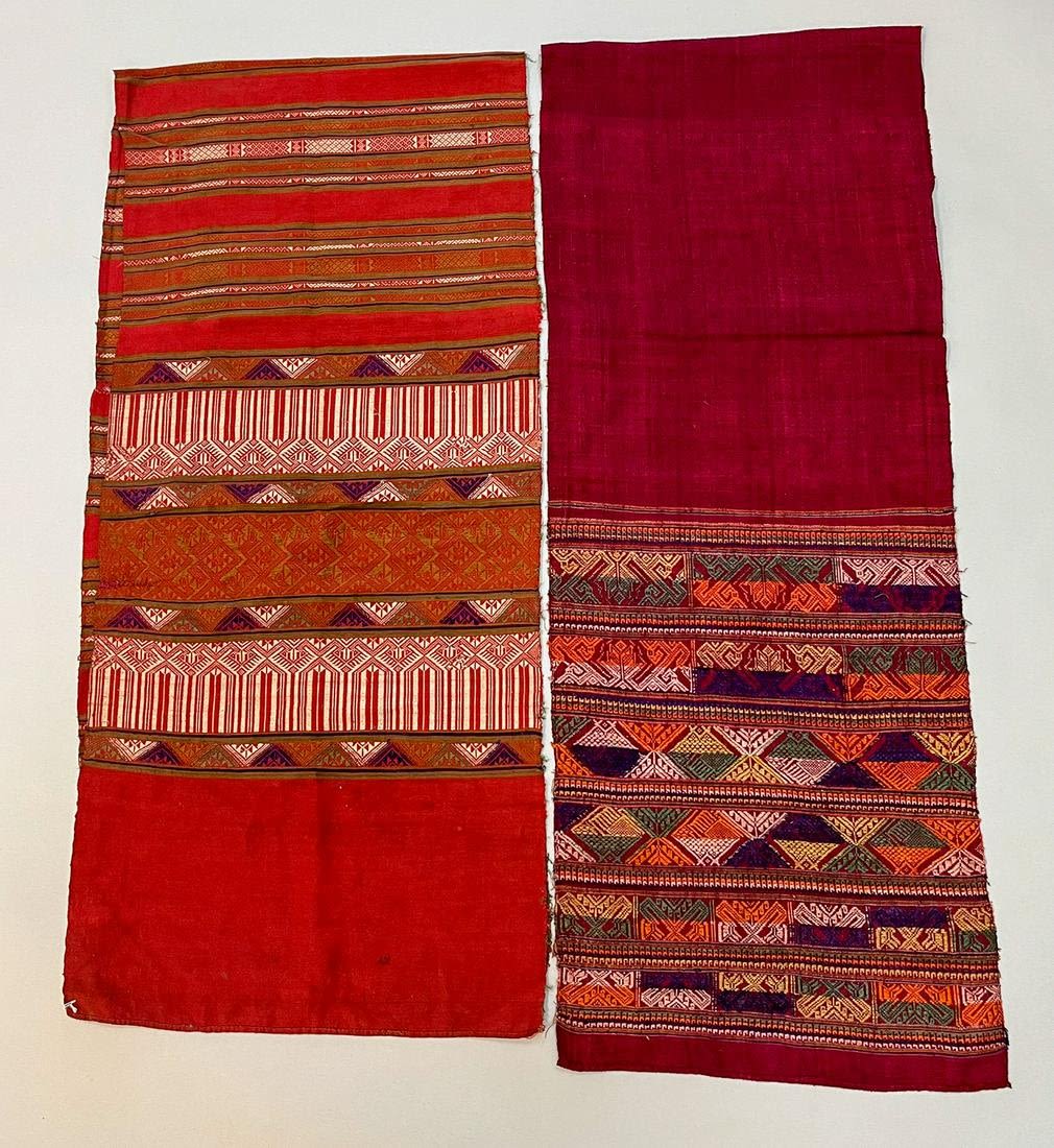 North Laos, group of (2) vintage silk scarfs, one in red ground with assorted color pattern, 74"l x 16"w, one in burgundy ground with multicolor traditional pattern, 53"l x 15"w