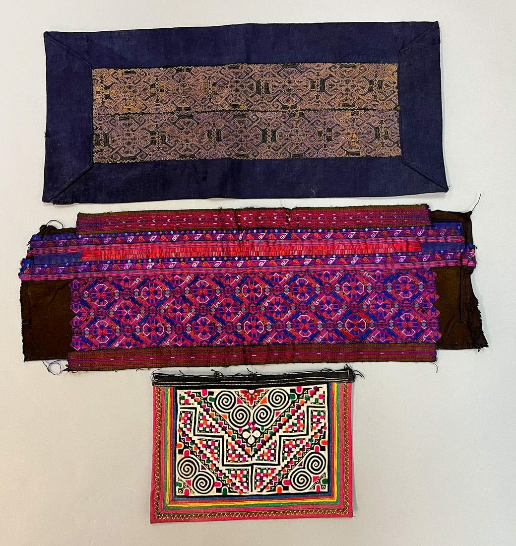 Miao, Yunnan Province, China, group of (3) vintage cotton and silk embroidery accessories, 18"l x 7"w, 16"l x 7"w , 8"l x 6"w