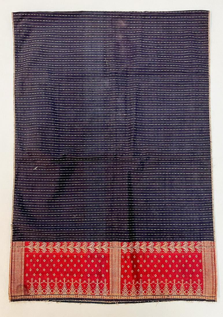 Pasaman, South Sumatra, Indonesia, vintage woven cotton "Selendang" shoulder cloth, indigo, burgundy ground with silk silver and gold faded metallic thread embroidery, 60"l x 20"w
