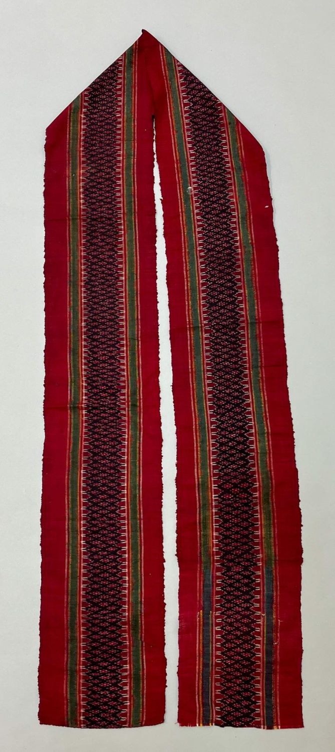 Thailand, vintage possibly raw silk scarf, burgundy ground with traditional pattern, 93"l x 7"w