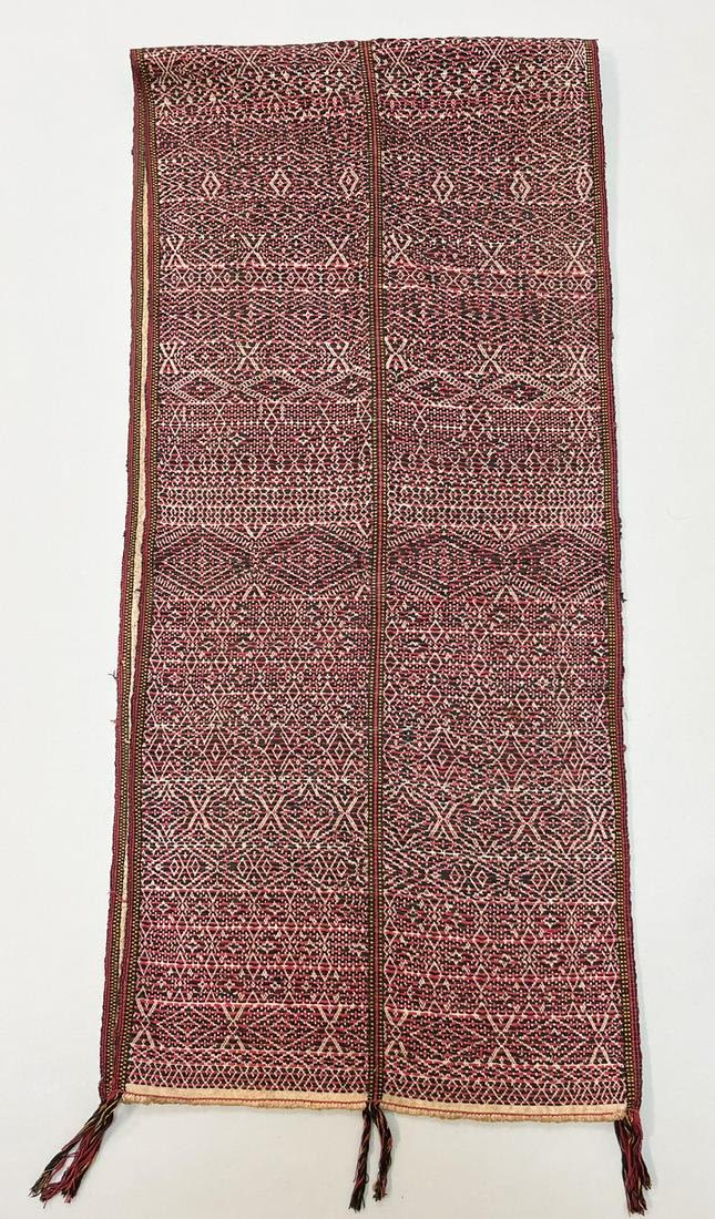 Kalasin Province, Thailand, vintage woven cotton textile, red, black, white with traditional woven pattern, 78"l x 17"w