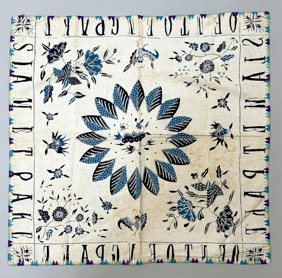 Jambi Sumatra, Indonesia, Batik square bandana, white ground with blue flower pattern and letters, 17"l x 17"w