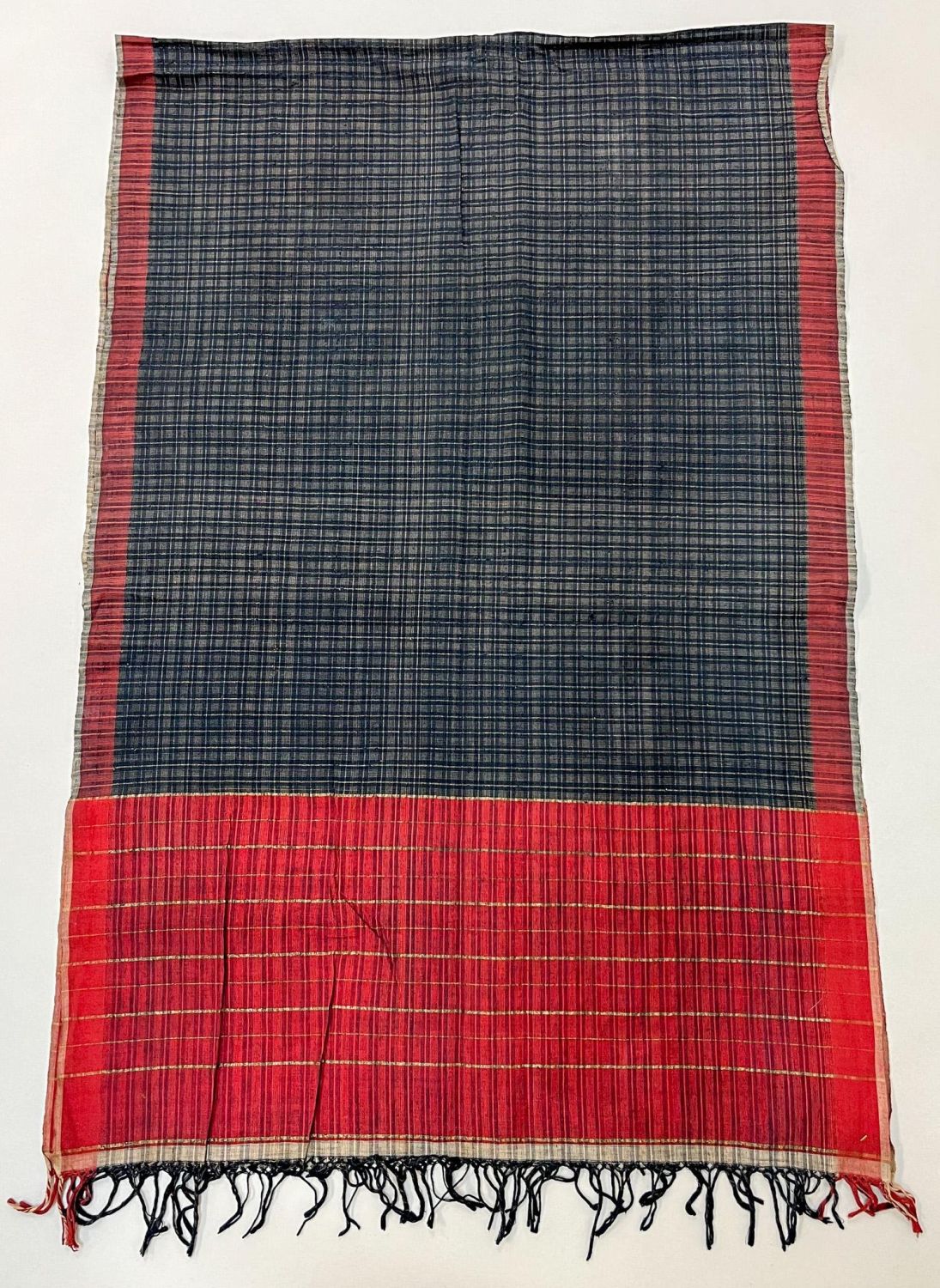 Minangkbau People, Sumatra, Indonesia, vintage cotton and pineapple leaf fiber "Selendang" shoulder cloth, indigo and red ground, stripe and check pattern accented with metallic thread, 79"l x 26"w