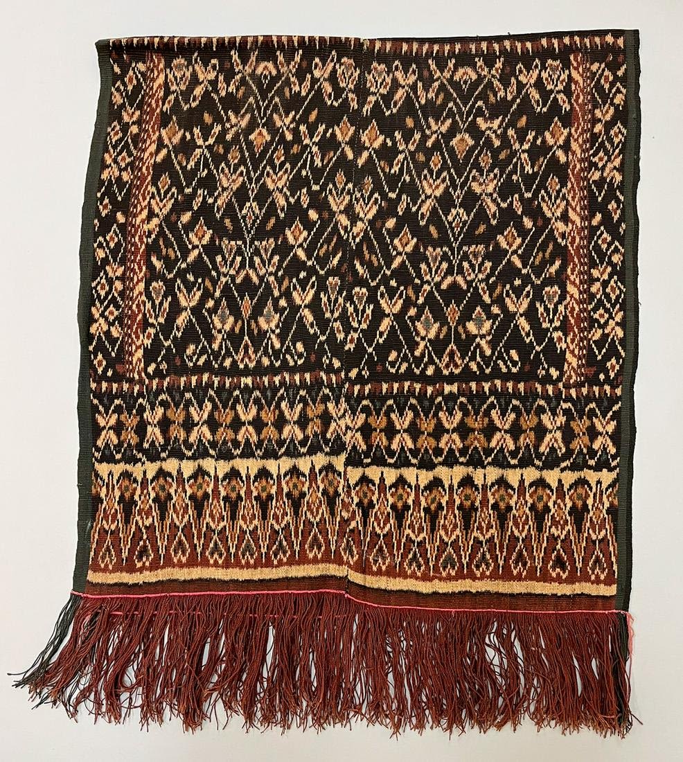 Roti, Indonesia, vintage woven cotton ikat textile, black ground with five color ikat traditional pattern, consists of two panels sewn together, 63"l x 28"w