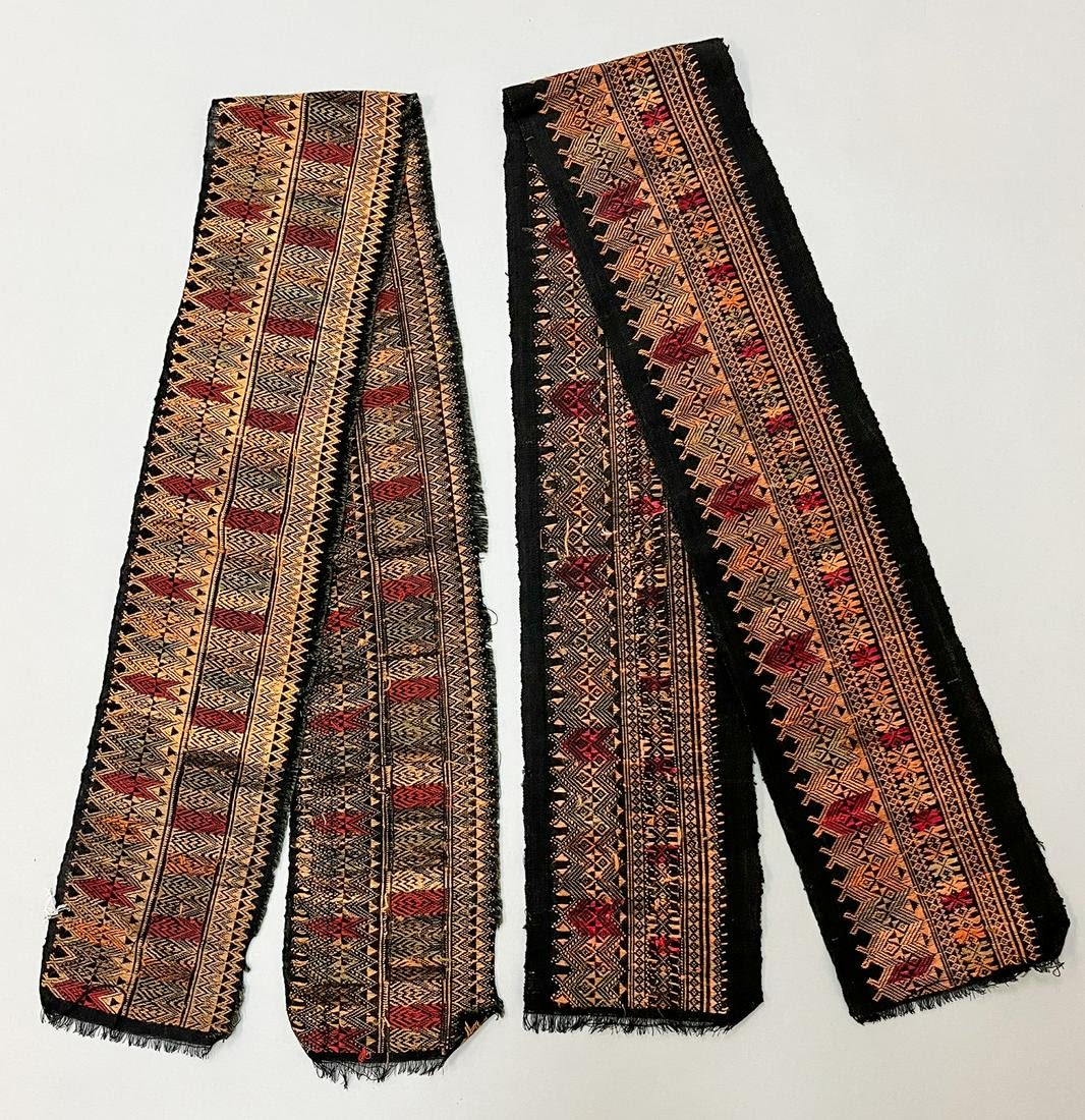 Laos, Group of (2) vintage cotton and silk brocade for skirt border, black ground with copper, red color traditional pattern, 59"l x 6"w, 58"l x 7"w