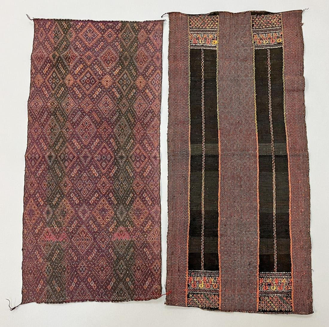 Khami Chin Hill Tribe, Myanmar (Burma), group of (2) vintage woven cotton "Akhin" ritual-dance breast covers, with muted color embroidery, 28"l x 13"w, 26"l x 12"w