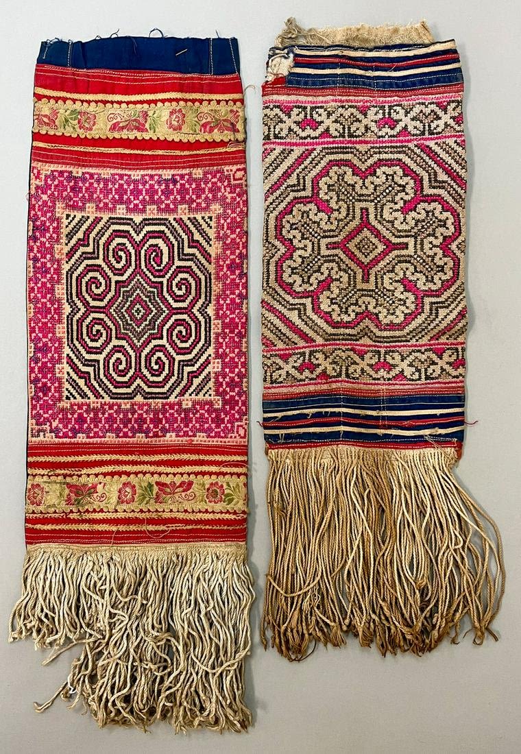 Hmong, Yunnan Province, Southern China, group of (2) vintage cotton embroidery possibly "Paj Ntaub" daily life story flower cloth pattern, 14"l x 6"w , 11"l x 5"w