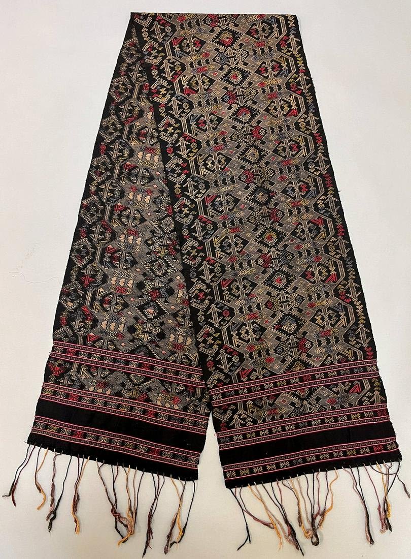 Laos, vintage cotton and silk brocade "Pha Phai" shoulder cloth, black ground with traditional assorted muted color pattern, 83"l x 14"w
