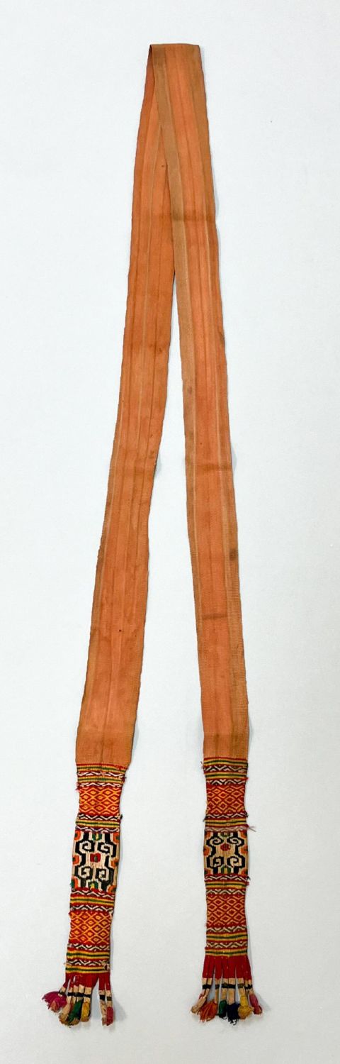 Timor, Indonesia, vintage woven cotton belt, terracotta color embroidered with traditional pattern on each end, 62"l x 2"w