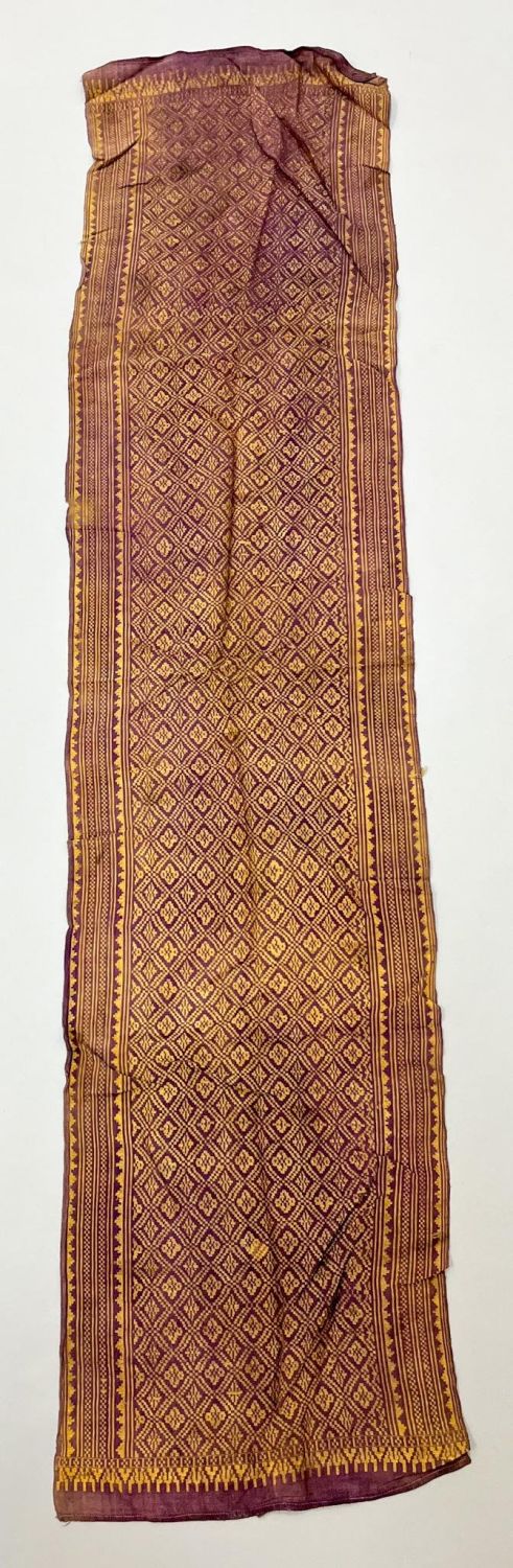 Lombok, Indonesia, vintage cotton and silk embroidery belt, purple ground with gold silk thread traditional pattern, 49"l x 11"w