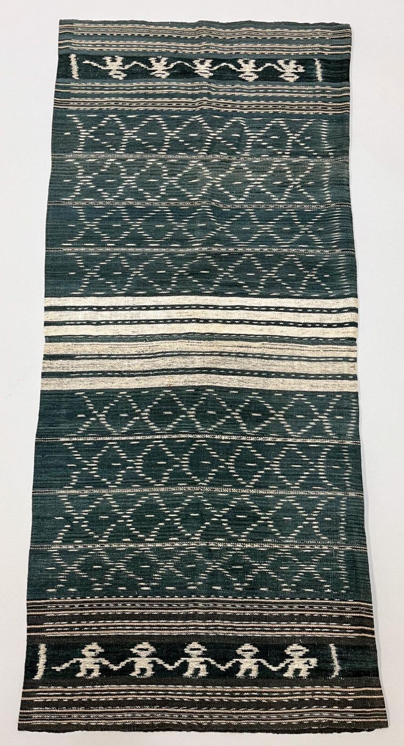 Tanimbar, Indonesia, vintage coarse cotton and lontar fiber ikat tubular sarong, slate ground with traditional stripes and motifs, 52"l x 24"w