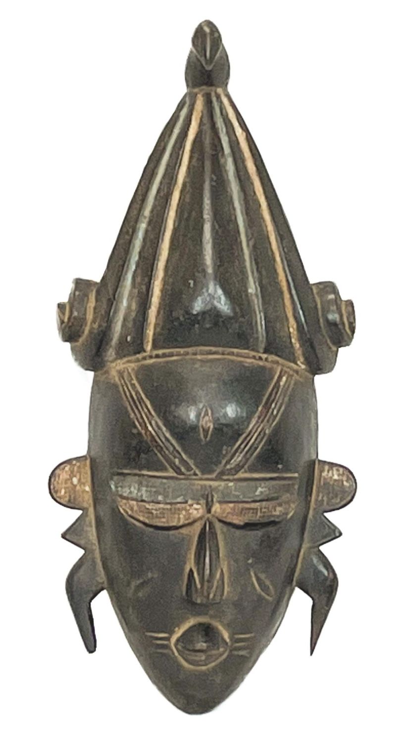 Kulango, Ivory Coast, carved wood mask with bird on top of headdress, darkened patina 17.75"h x 8"w x 2.5"d
