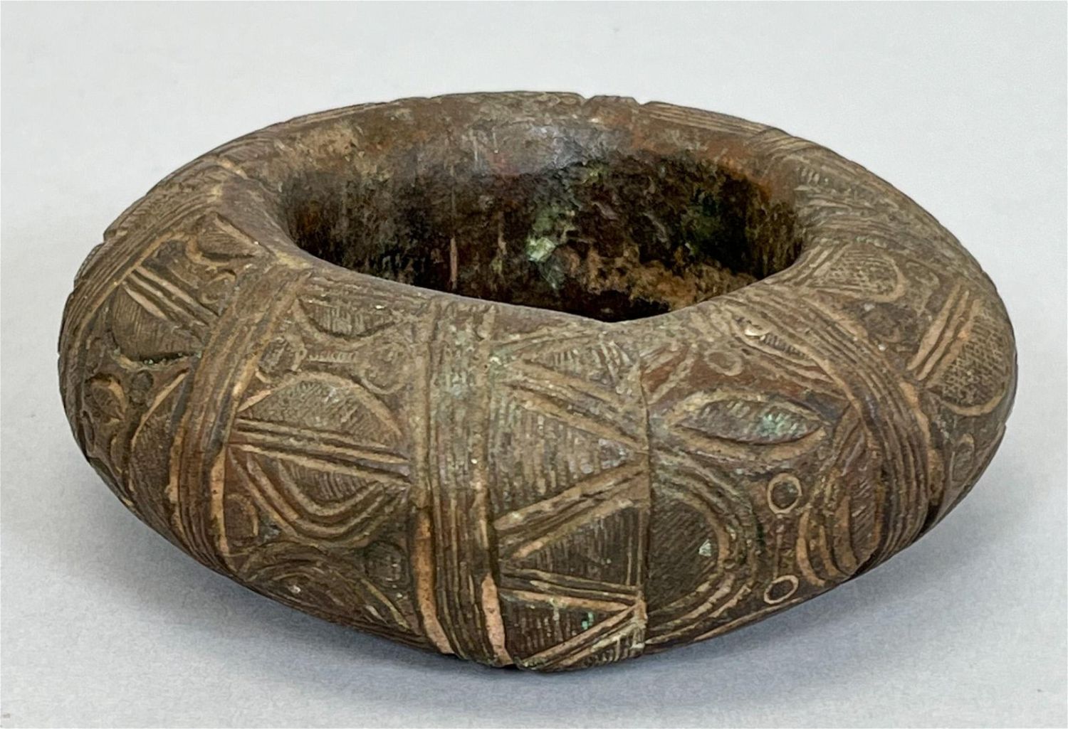 Ashanti, Ghana, bronze currency bracelet, heavy cast with symbols, 1.5"h x 4.25"d