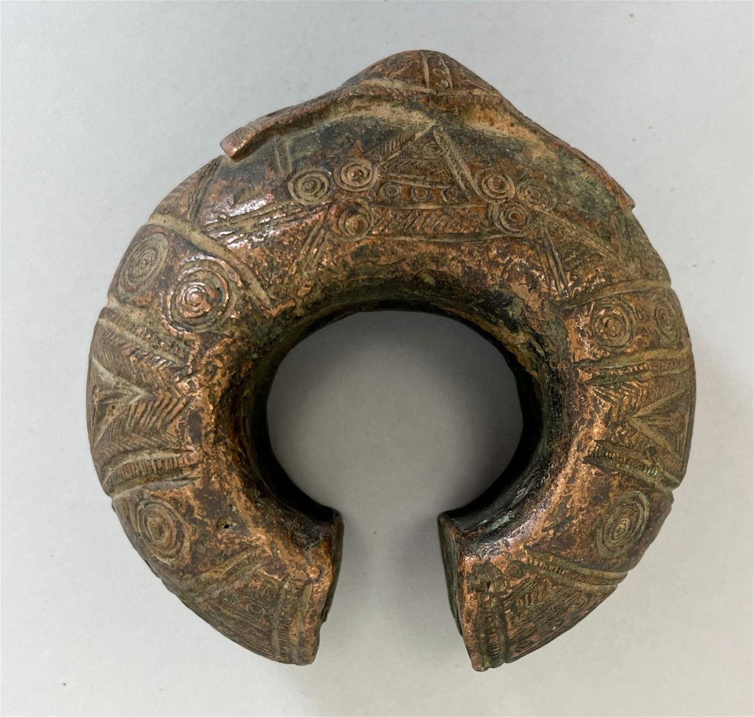 Dogon, Mali, bronze/copper currency cuff, heavy cast, with engraved symbols, 2"h x 5"d