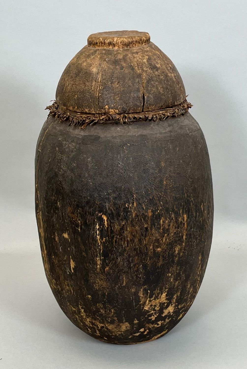 Africa, carved wood vessel with lid, possibly raffia woven on bottom part and top edge, 20"h x 8"d