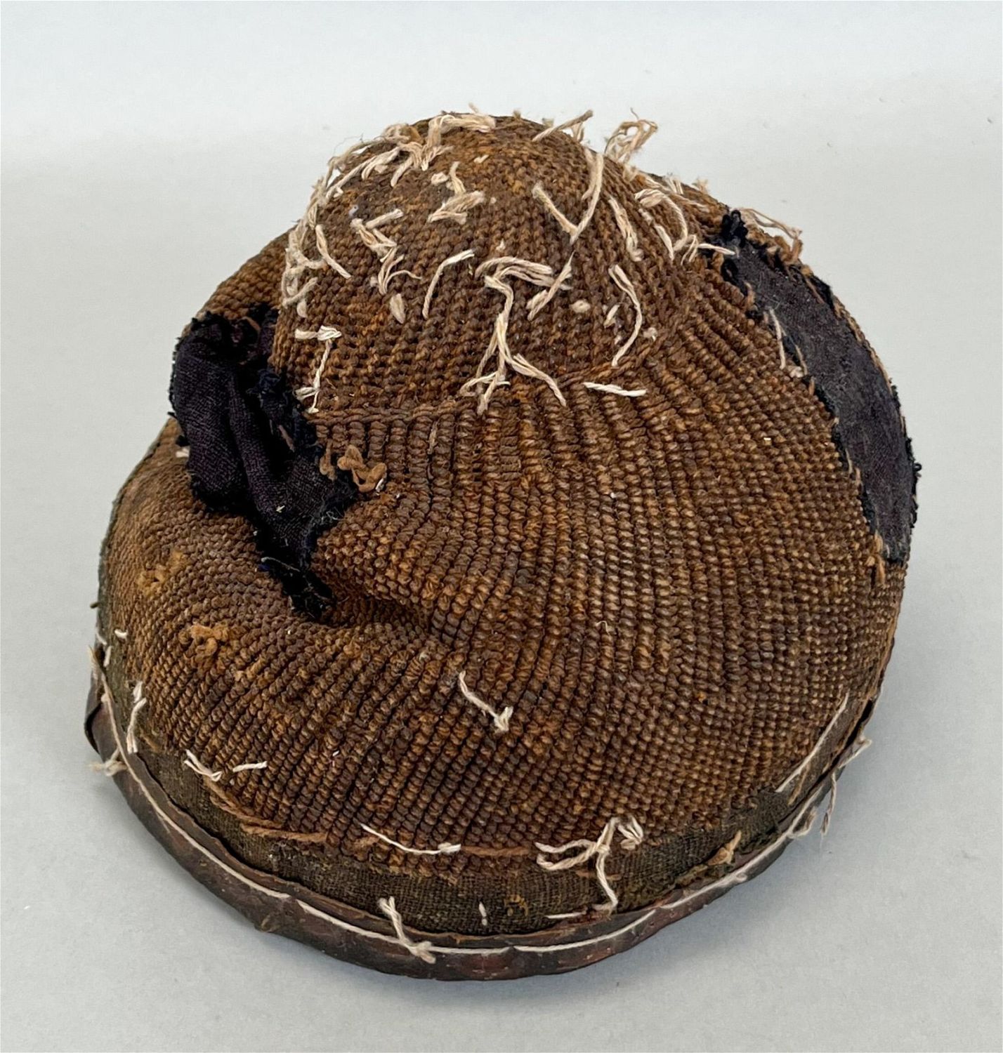 Bamum people (also called Bamoun or Mum), Cameroon, hunter’s hat, cotton woven with leather accents on edge and fabric lining, 7"h x 8"d