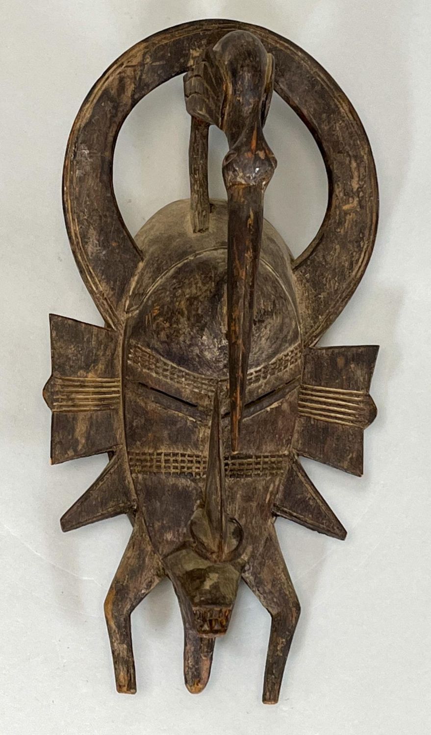 Possibly Senufo, Ivory Coast, carved wood mask with bird on top, 17"h x 9"w x 3"d