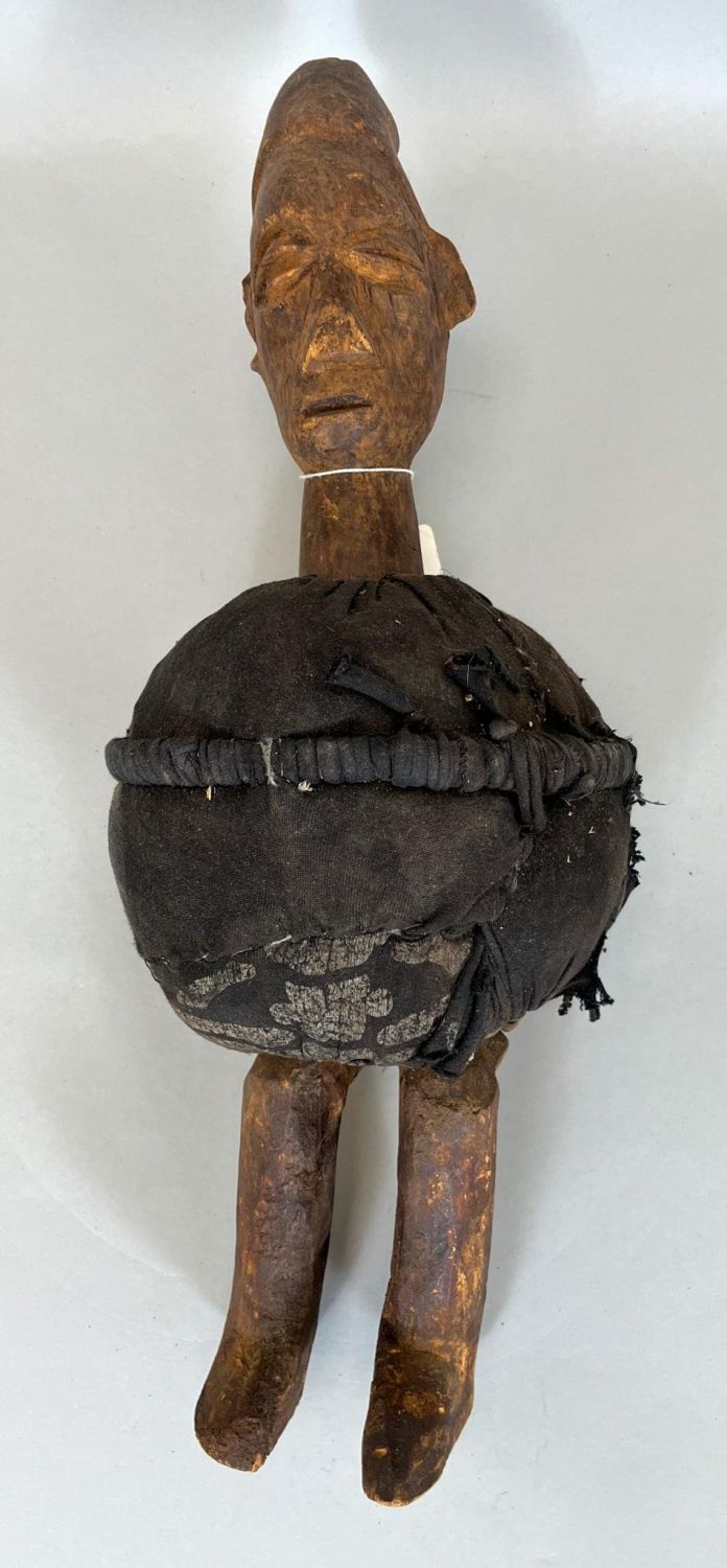 Yaka People, Zaire (DR Congo), carved wood fetish with round black cloth belly, 20"h x 7"d