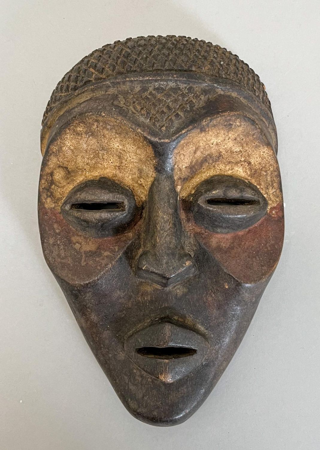 Possibly Chokwe People, Angola, carved wood mask with white and red pigment, 9"h x 6"w x 1.75"d