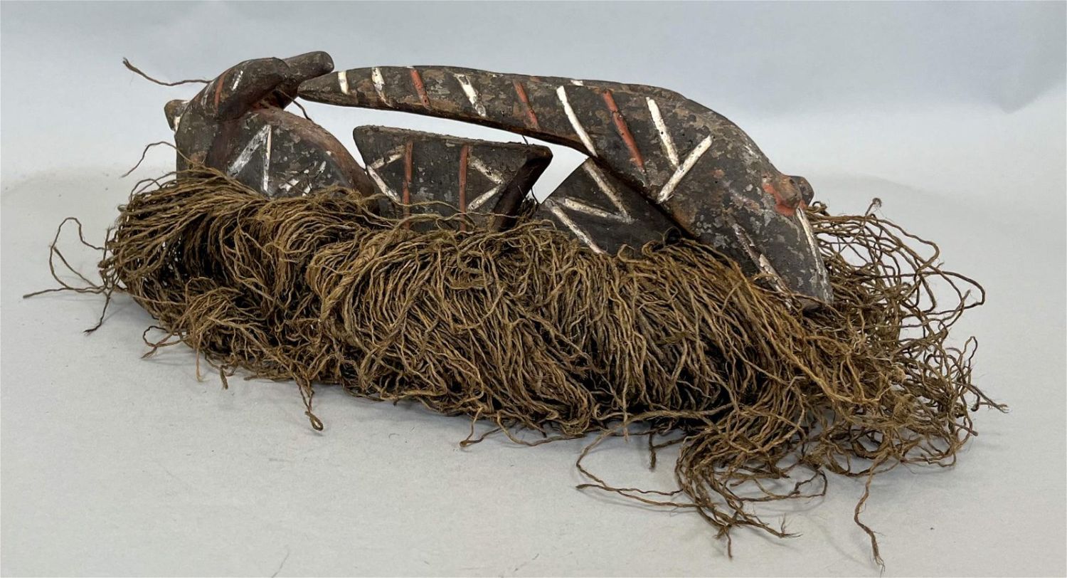 Mossi/Gur People, Burkina Faso, carved wood gazelle mother and fawn figure head mask, darkened patina with white pigment, cotton threads and fabric head cover 9"h x 12.5" w