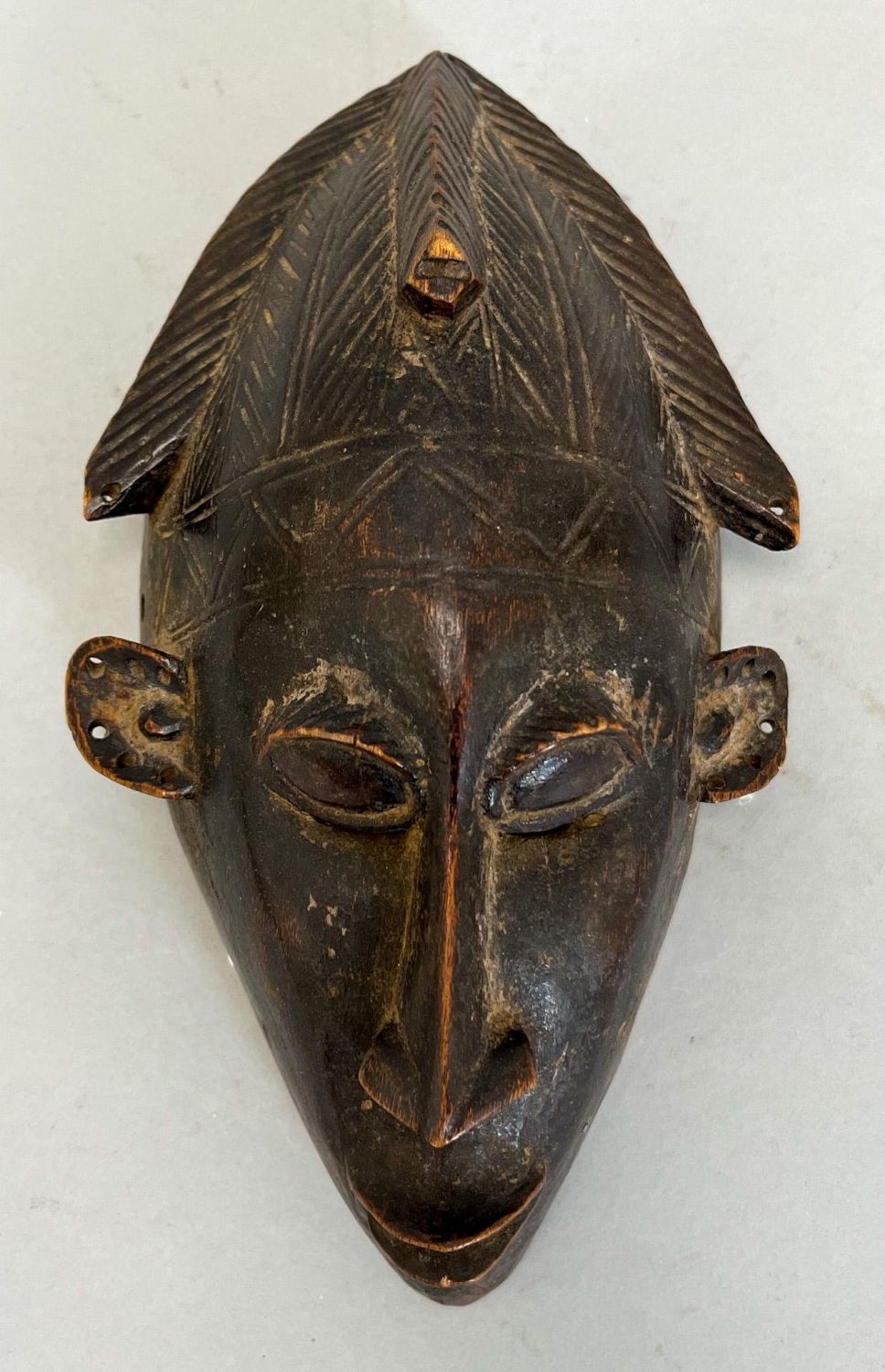 Bambara, Mali, wood mask, darkened patina with remnant red pigment, herringbone pattern on head, 9"h x 5.25"w x 1.75"d