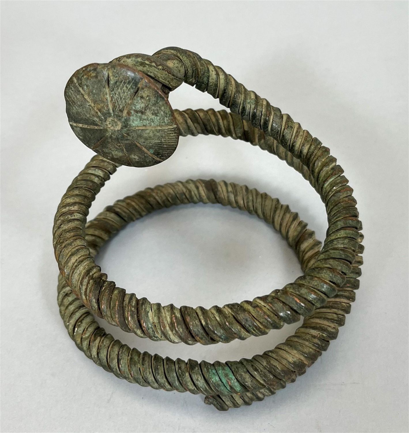 Yoruba Igbo, Nigeria, coiled bronze bracelet currency, with a flower-form, 5" d