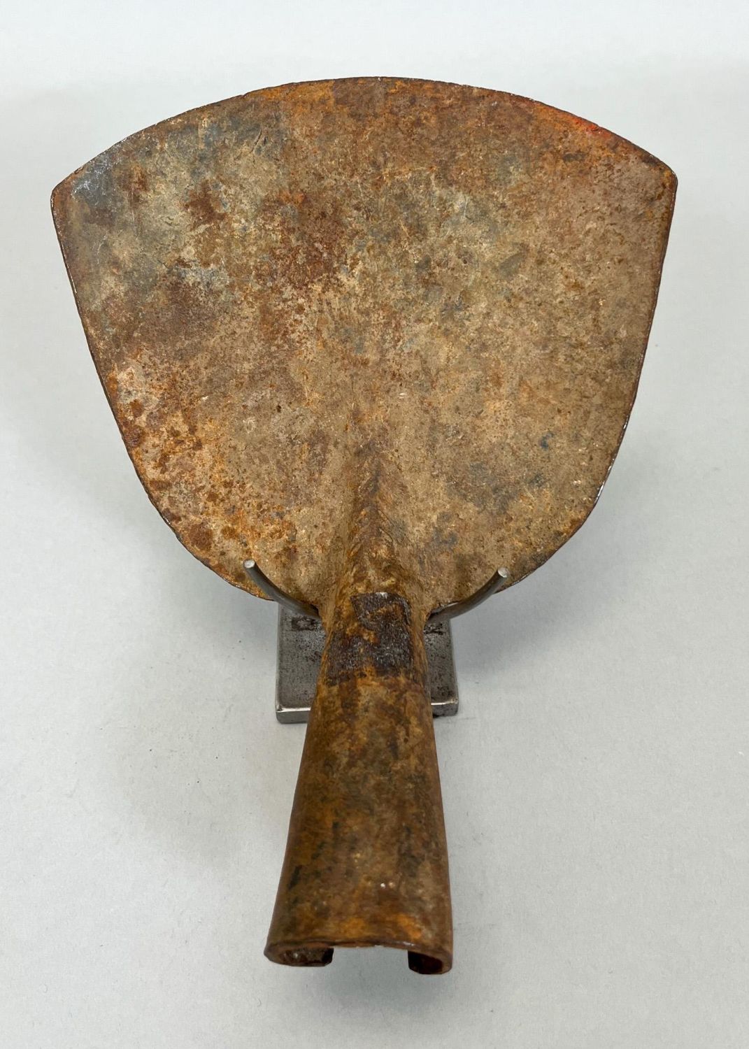 Mambila, Nigeria, forged iron hoe tool currency with metal stand, 4"h x 6"w