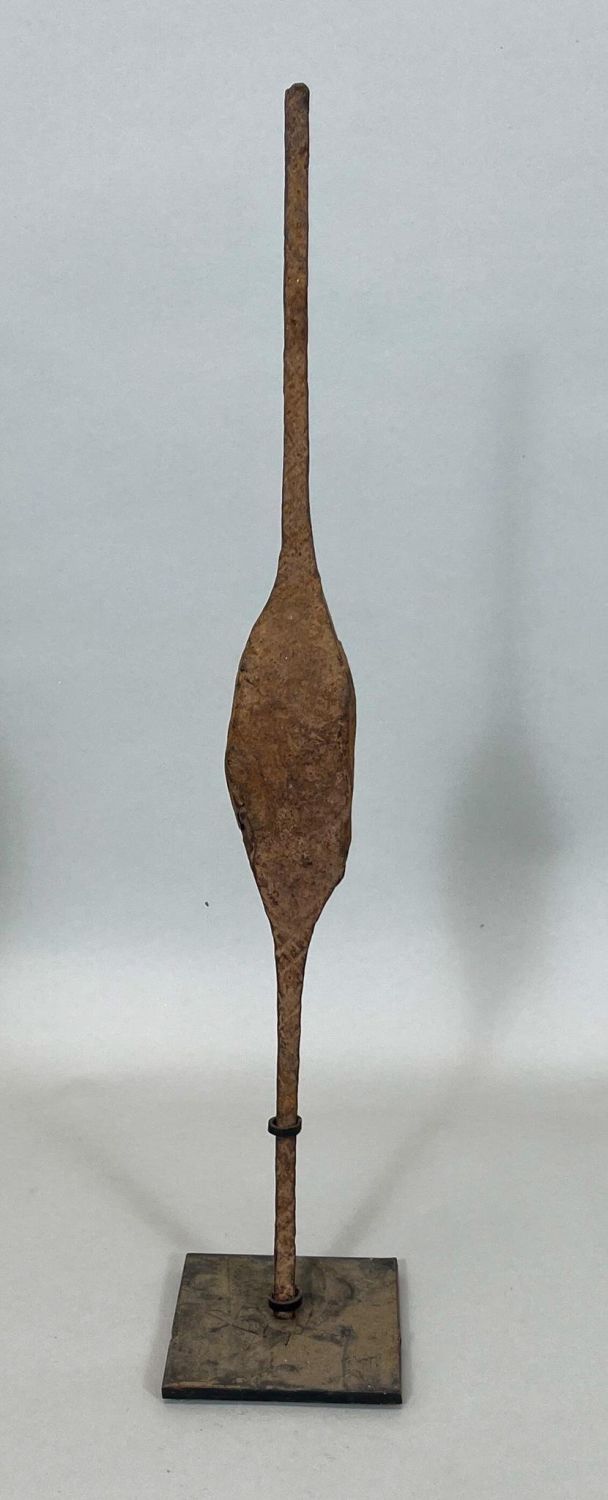 Mumuye (Fulani and Jukun) People, Eastern Nigeria, Tajere (Ingot) forged iron currency, diamond shaped form with metal stand, 20.5"h x 2"w