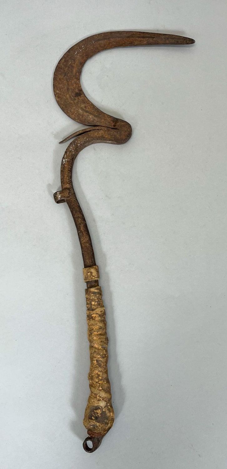 Chad, Cameroon, forged iron sickle ceremonial throwing knife with leather wrapped handle, 21"h x 8"w