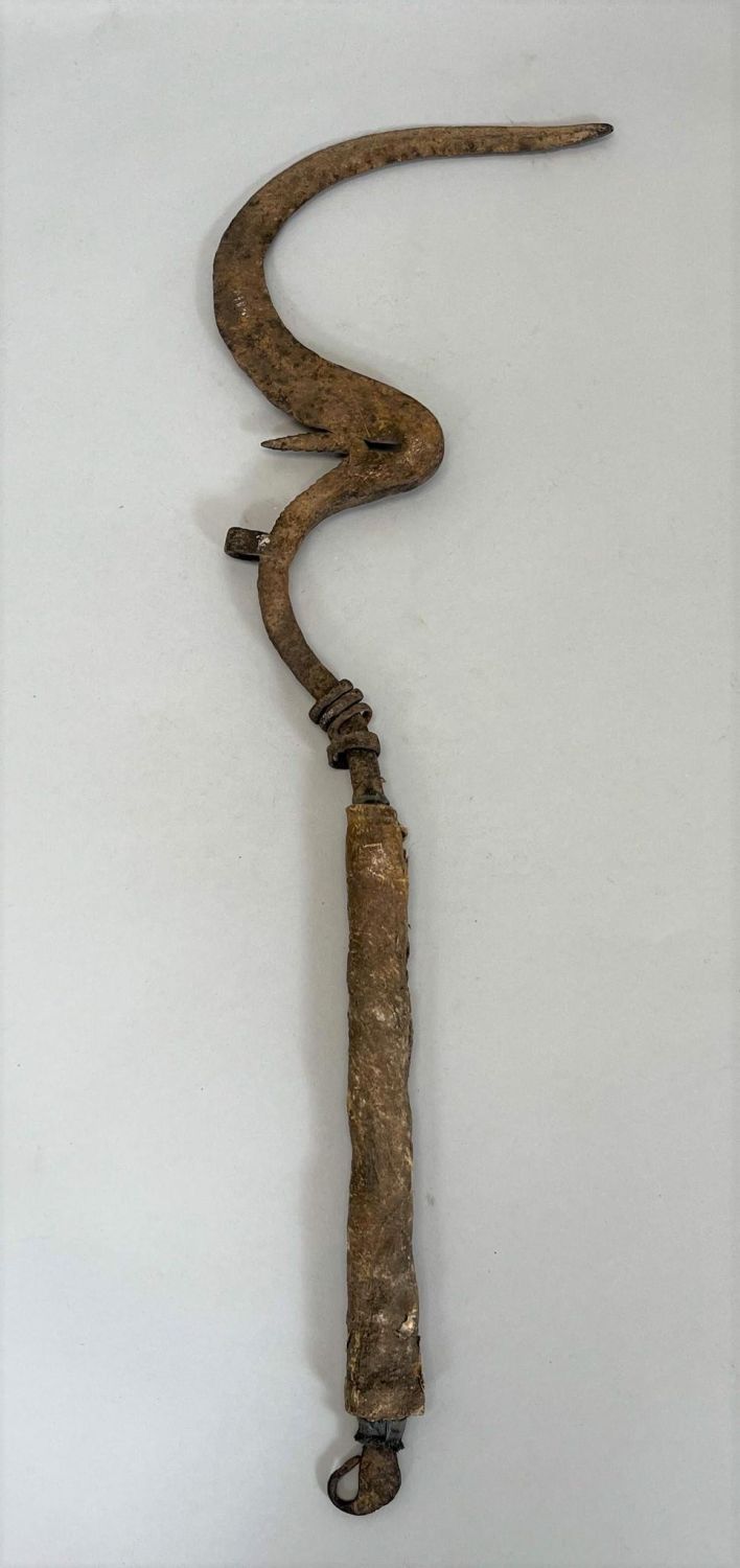 Chad, Cameroon, forged iron sickle ceremonial throwing knife with rings, leather wrapped handle, 25"h x 8.75"w