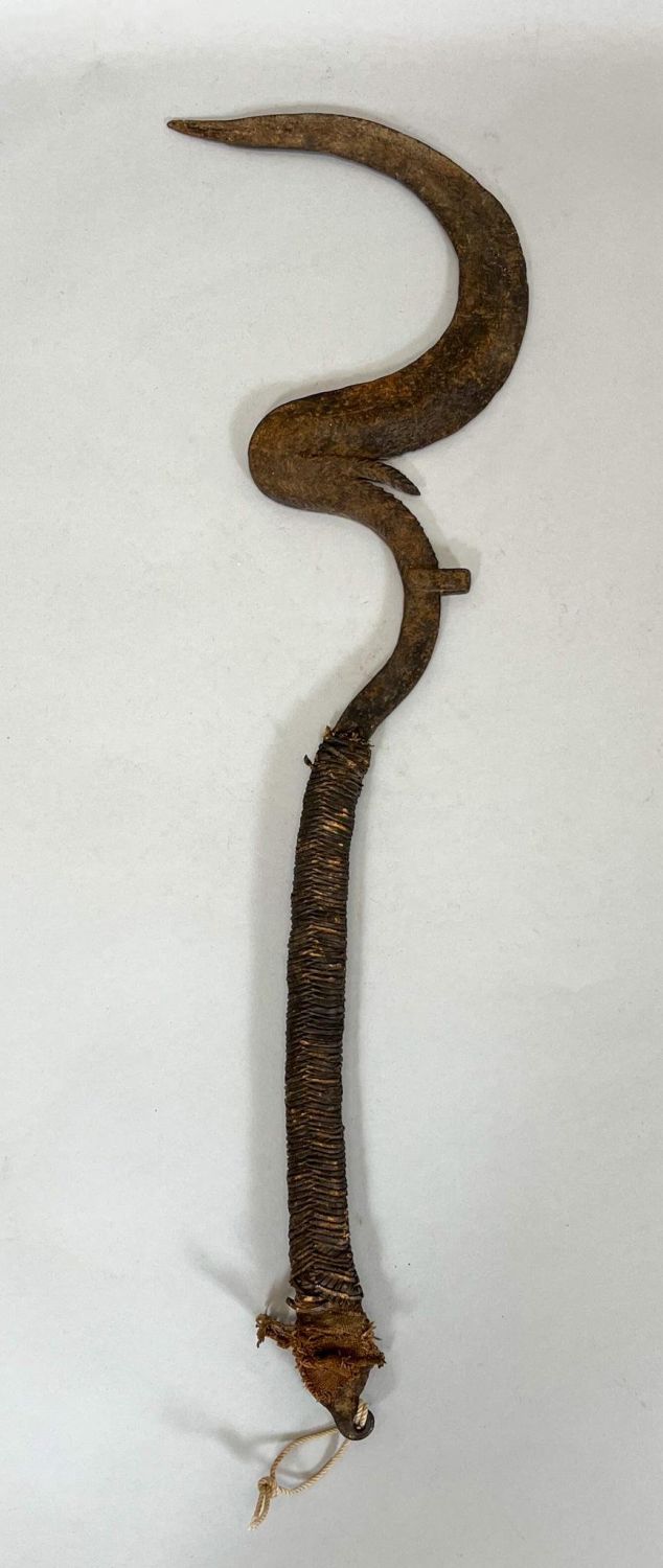 Chad, Cameroon, forged iron sickle ceremonial throwing knife with woven leather wrapped handle, 25.5"h x 8.75"w