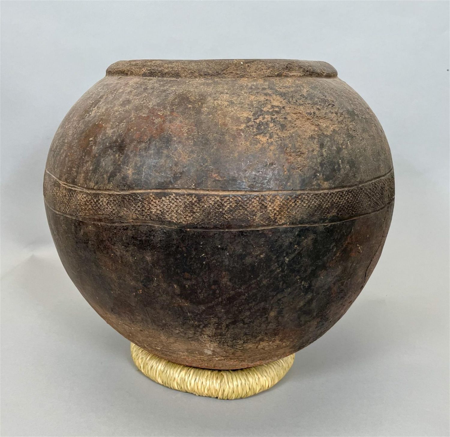 Gurunsi, Burkina Faso, large terracotta water vessel, dark fired color with incised decorative pattern, 15"h x 15.5" diam