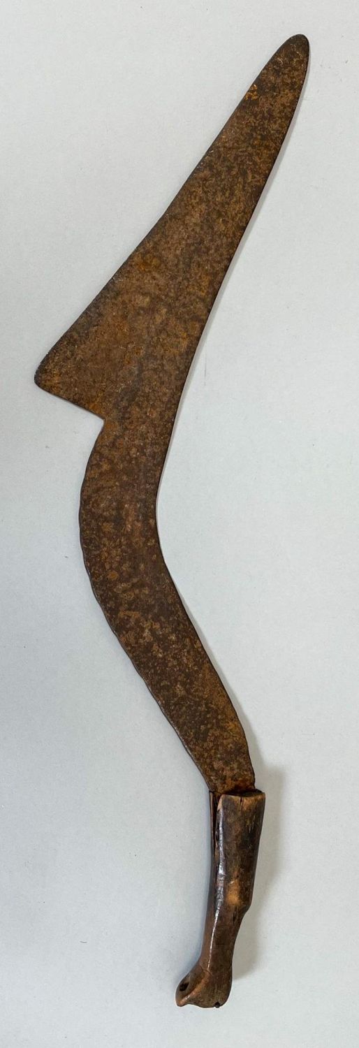 Ngombe, Zaire (DR Congo), sickle double edged knife, forged iron with wooden handle, 20.5"h x 3"w