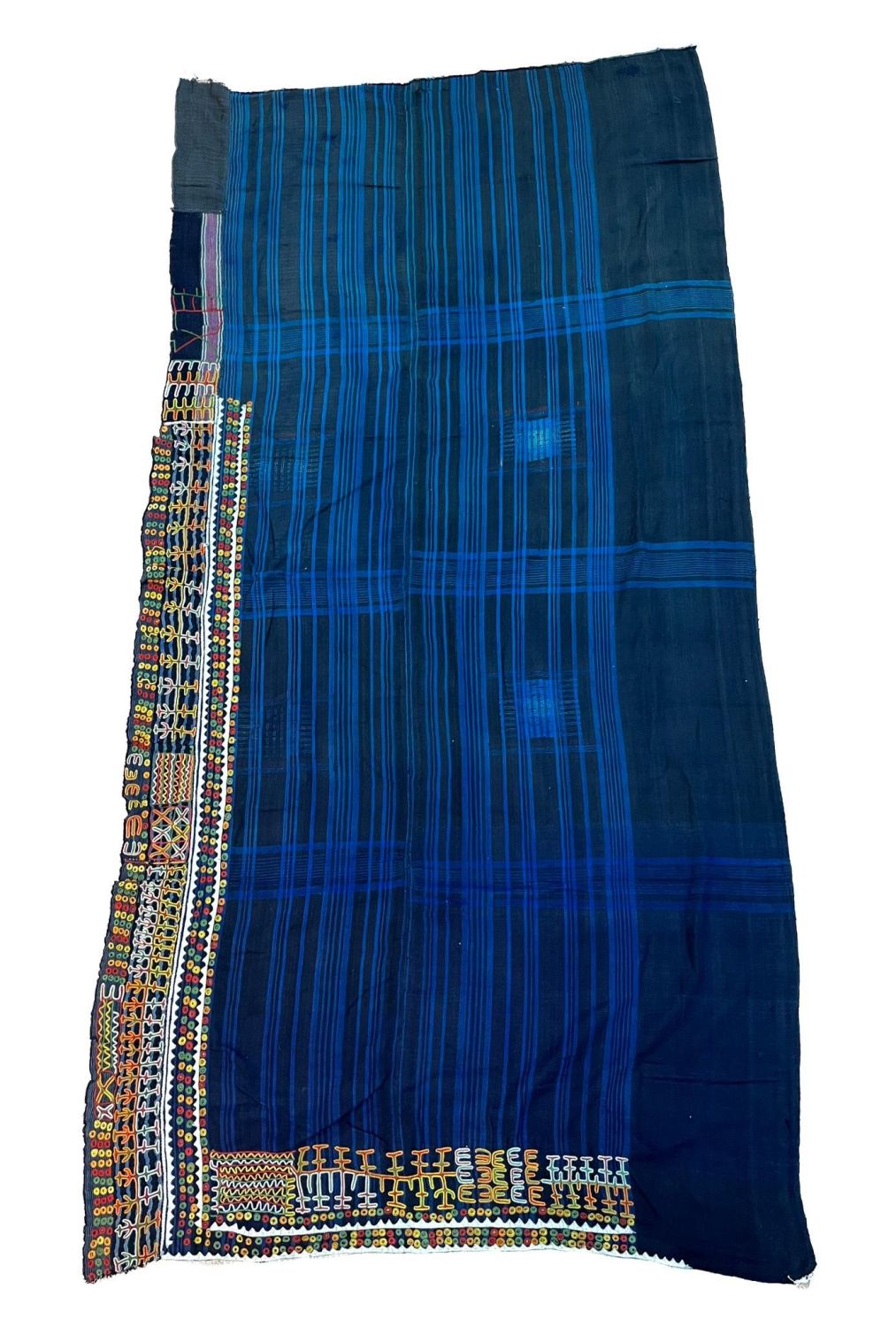 Taureg, Niger, vintage woven cotton textile, black and indigo color stripes with colorful embroidery patterns, 67"l x 34"w