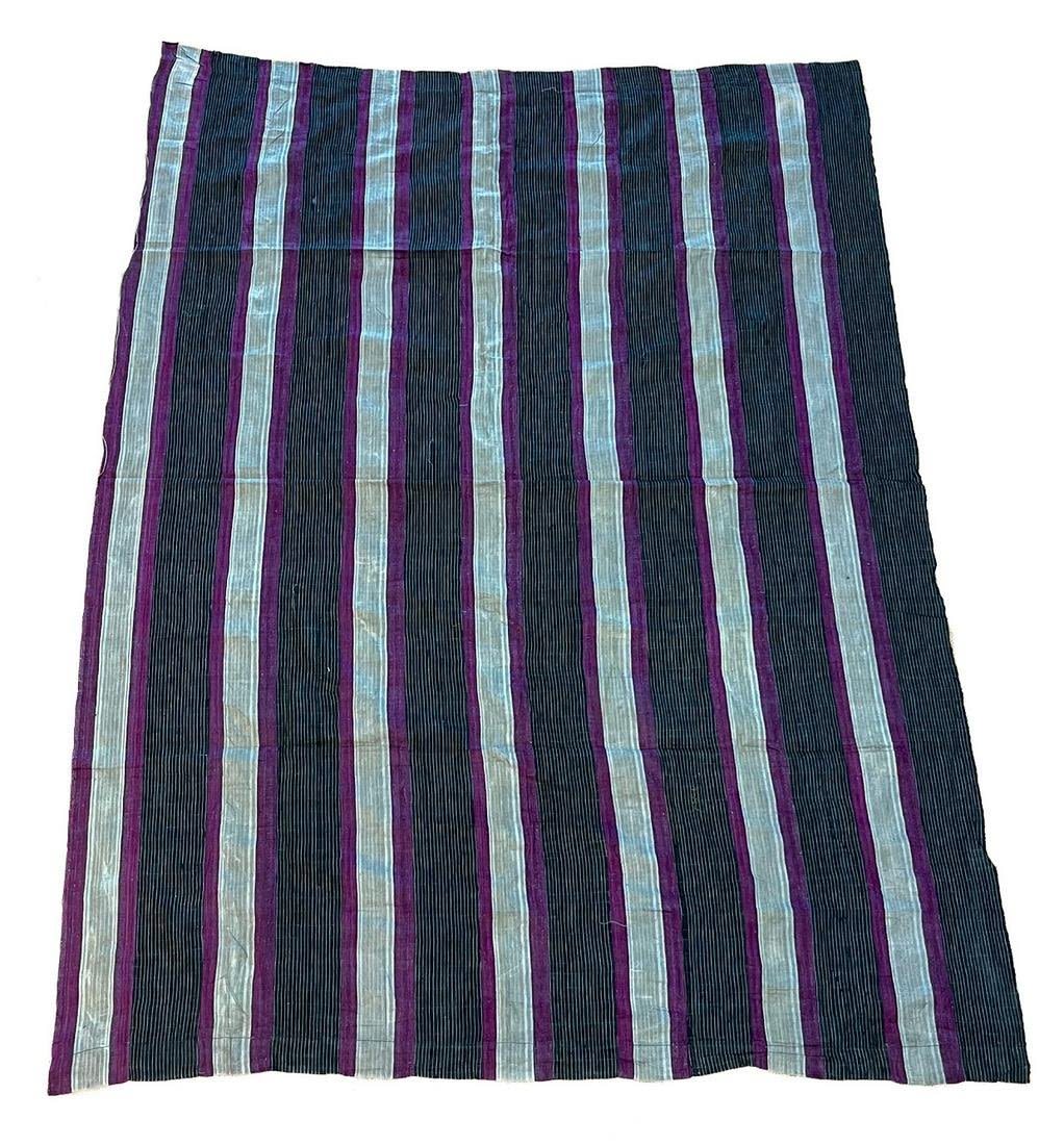 Republic of Benin, West Africa, vintage woven cotton textile, black, light grey with purple stripe pattern, panels sewn together, each panel 4"w, 73"l x 54"w
