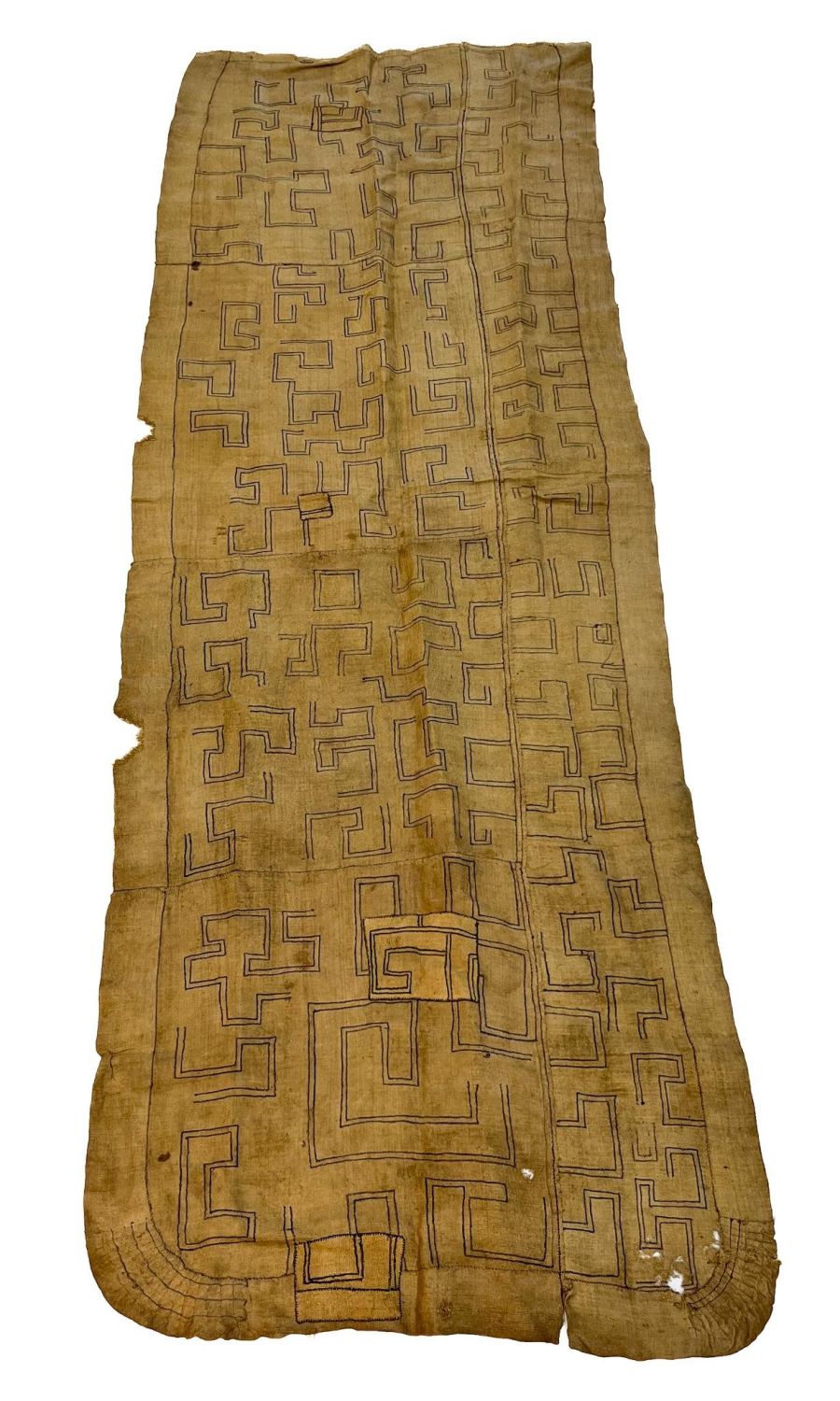 Kuba, Zaire (DR Congo), vintage woven palm fiber ceremonial textile, square panels with blue color stitch sewn together each panel 19" x 19", 84"l x 28"w