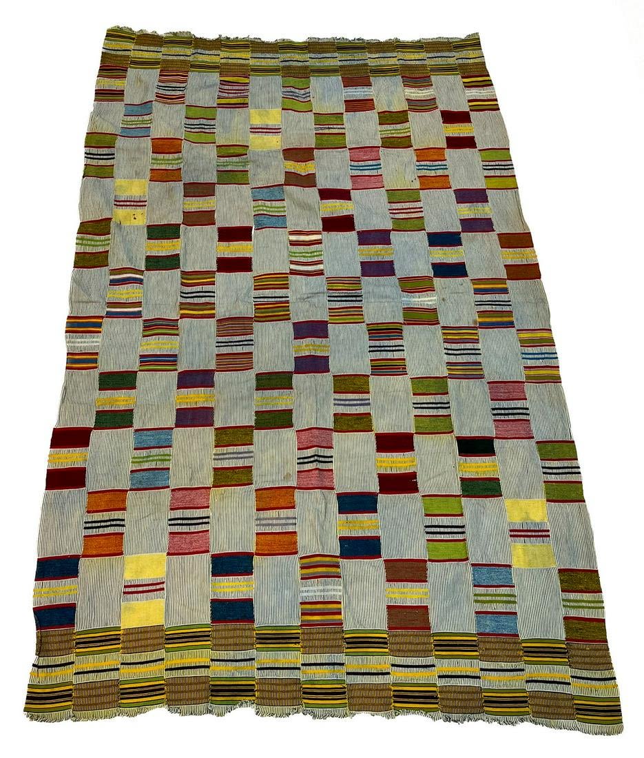 Ewe, Ghana, vintage Kente woven silk and cotton textile, multicolor stripe and check pattern sewn together, each panel 3.5"w, 72"l x 46"w