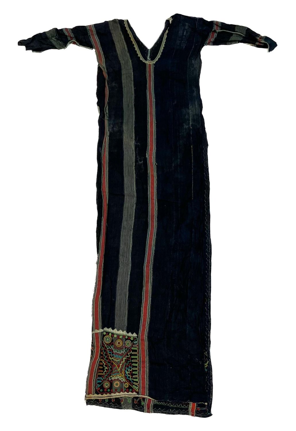 Fulani/ Wodaabe Bororo, Niger, "Yaake" man’s dance tunic, open short sleeves, black and red stripe with colorful embroidery patterns and applique, 42"l x 13"w