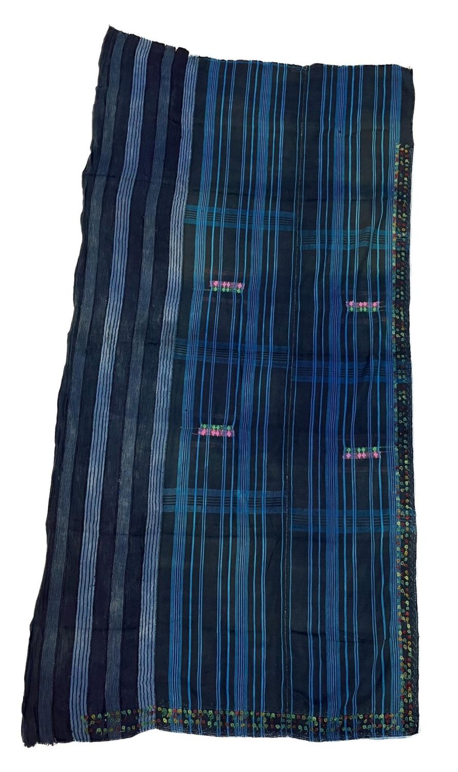 Fulani, Niger, vintage woven cotton textile, indigo, light blue stripes with multicolor embroidery panels pattern sewn together, panel are 10 and 2"w, 63"l x 32"w