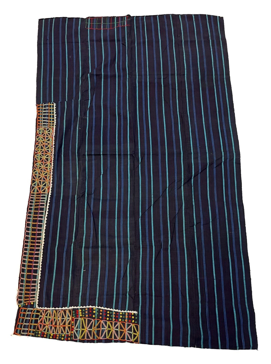 Fulani, Niger, vintage woven cotton textile, indigo, light blue stripes with multicolor embroidery panels pattern sewn together, each panel 10"w, 63"l x 38"w