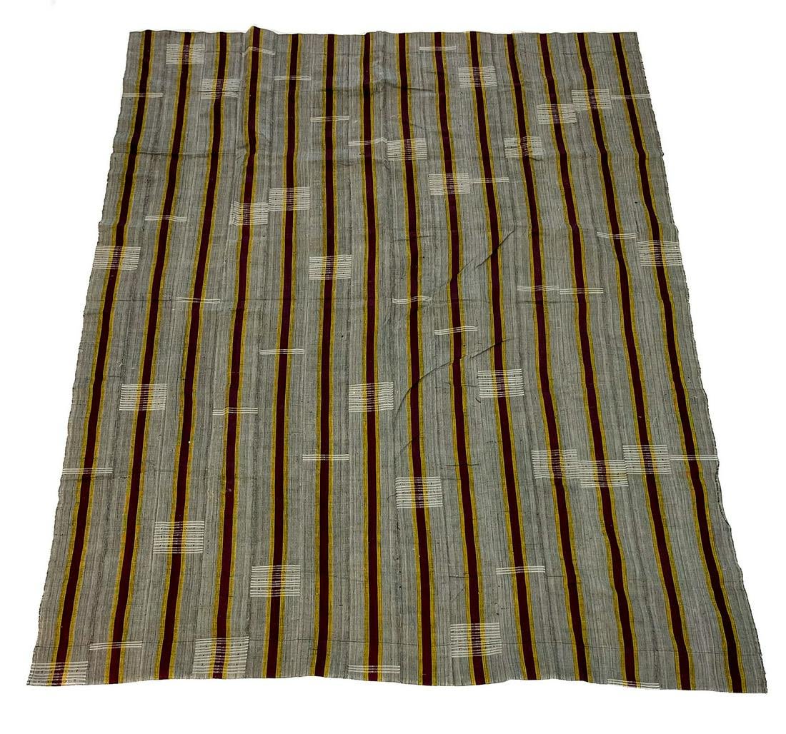 Yoruba, Nigeria, vintage woven cotton Aso Oke textile, dark grey, yellow, burgundy color stripe pattern, panels sewn together, each panel 4"w, 71"l x 57"w