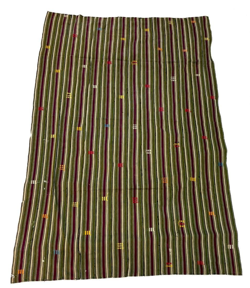 Ewe, Togo, vintage Kente woven silk and cotton textile, green, purple, white stripes with colorful embroidery panels pattern sewn together, each panel 3.5"w, 73"l x 50"w
