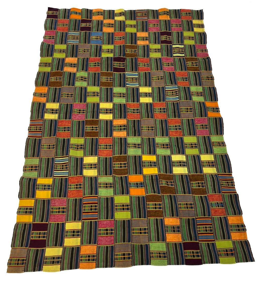 Ewe, Togo, vintage Kente woven silk and cotton textile, multicolor stripes and check pattern sewn together, each panel 3"w, 76"l x 48"w