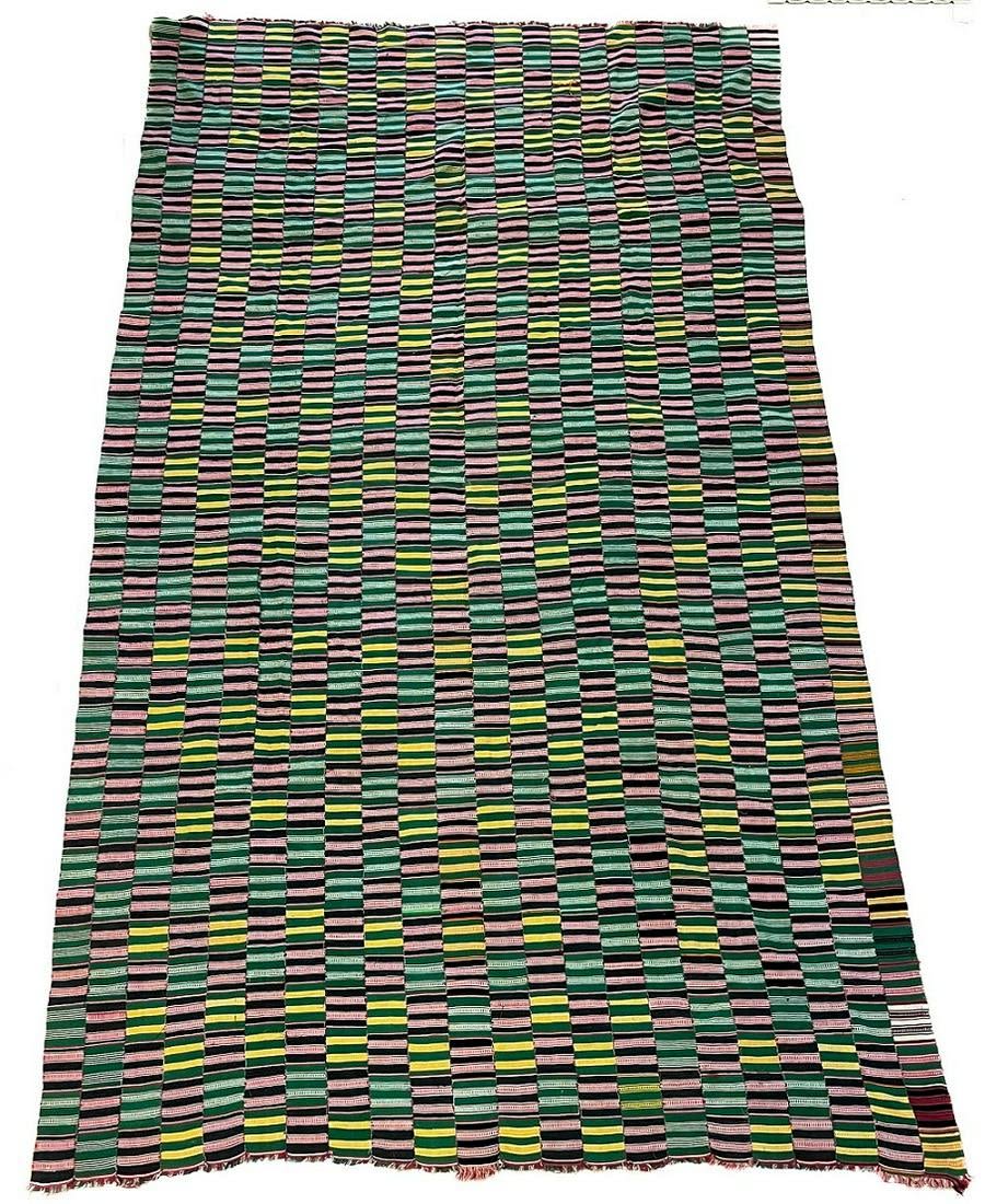 Ewe, Togo, vintage Kente woven silk and cotton textile, multicolor stripes and check pattern sewn together, each panel 3"w, 126"l x 73"w