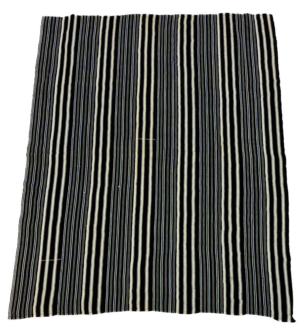 Yoruba, Nigeria, vintage woven cotton Aso Oke textile, blue, white and black color stripe pattern, panels sewn together, each panel 4”w, 59”l x 47”w PROVENANCE: From the estate of Professor Philip Gould, New York