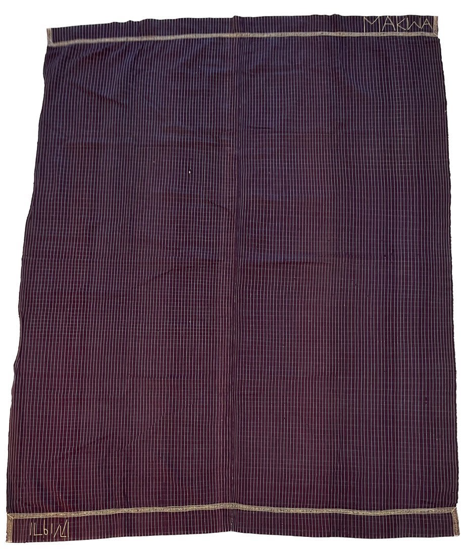 Yoruba, Nigeria, vintage woven cotton Aso Oke textile, purple and light blue color stripe pattern, stitched “ MAKAWA/1971”, panels sewn together, each panel 28”w, 74”l x 57”w PROVENANCE: From the estate of Professor Philip Gould, New York